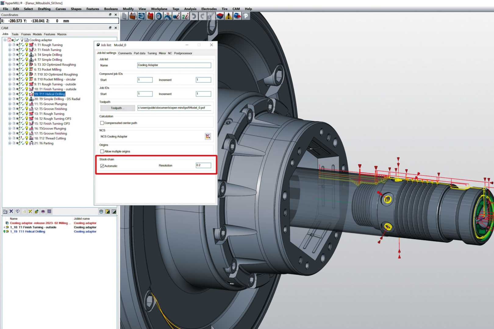 De nieuwe automatische ruwmateriaalketen biedt zekerheid, vooral bij het wisselen tussen draai- en freesbewerkingen of andere projecten met een groot aantal processtappen. Hypermill creëert alle voorraad automatisch en in de juiste volgorde, zelfs als de opdrachtvolgorde is gewijzigd.